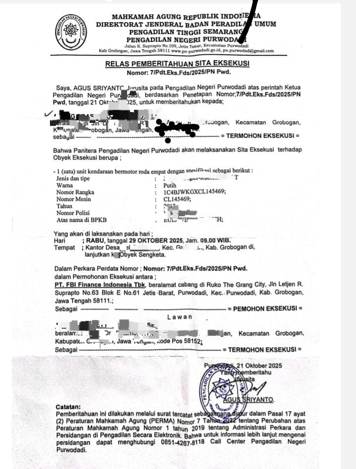 Purwodadi, — Mediaindonesiamaju.com Proses peradilan di Pengadilan Negeri (PN) Purwodadi kembali menjadi sorotan publik. Seorang debitur berinisial AS, warga Kecamatan Grobogan, mengaku dikejutkan oleh surat sita eksekusi yang diterbitkan PN Purwodadi. Surat tersebut diduga mengandung kesalahan ketik berulang kali pada bagian nama pihak penggugat yang merupakan salah satu perusahaan leasing di Kota Semarang.
