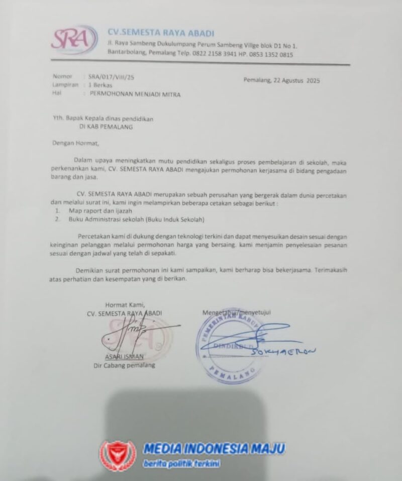 Pemalang, – Mediaindonesiamaju.com Sebuah kasus dugaan kongkalikong surat sakti untuk meluluskan penawaran sampul dan map raport mencuat ke publik. Surat yang diduga berasal dari Dinas Pendidikan dan Kebudayaan Kabupaten Pemalang ini diduga digunakan untuk memuluskan praktik penjualan sampul dan map raport di sekolah-sekolah.