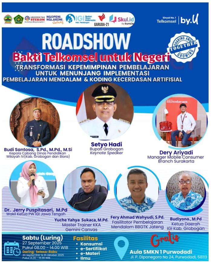 GROBOGAN, Mediaindonesiamaju.com— Telkomsel menggelar Roadshow Bakti Telkomsel untuk Negeri dengan tema Transformasi Kepemimpinan Pembelajaran untuk Menunjang Implementasi Pembelajaran Mendalam dan Koding Kecerdasan Artifisial, sebagai langkah konkret mendorong dunia pendidikan memasuki era digital berbasis kecerdasan buatan.