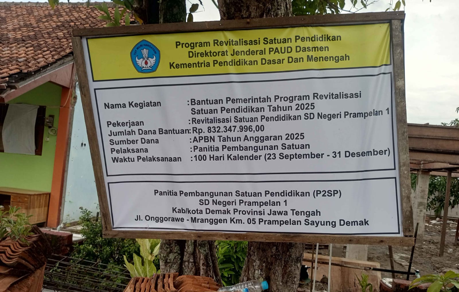 DEMAK — Mediaindonesiamaju.com Bau tak sedap menyeruak dari proyek revitalisasi SDN Prampelan 1, Kecamatan Sayung, Kabupaten Demak. Bantuan pemerintah tahun anggaran 2025 senilai Rp832.347.996 yang seharusnya dikerjakan secara swakelola oleh P2SP (Panitia Pembangunan Satuan Pendidikan), diduga kuat malah jatuh ke tangan pihak ketiga — CV Cahaya Muda Karangawen.