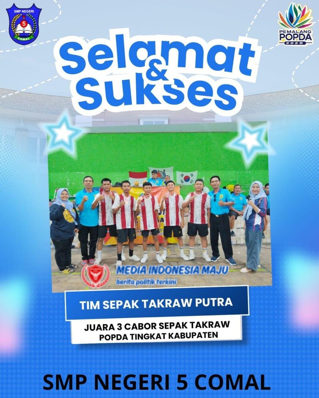 Pemalang, – Mediaindonesiamaju.com SMP Negeri 5 Comal kembali menunjukkan keunggulannya dalam dunia olahraga dengan meraih juara umum pada gelaran Pekan Olahraga Pelajar Daerah (POPDA) Kabupaten Pemalang Tahun 2025. Sekolah yang terletak di Kabupaten Pemalang, Jawa Tengah ini berhasil menyabet dua penghargaan bergengsi, yaitu juara 1 untuk cabang olahraga sepak takrow putri dan juara 3 untuk cabang olahraga sepak takrow putra.